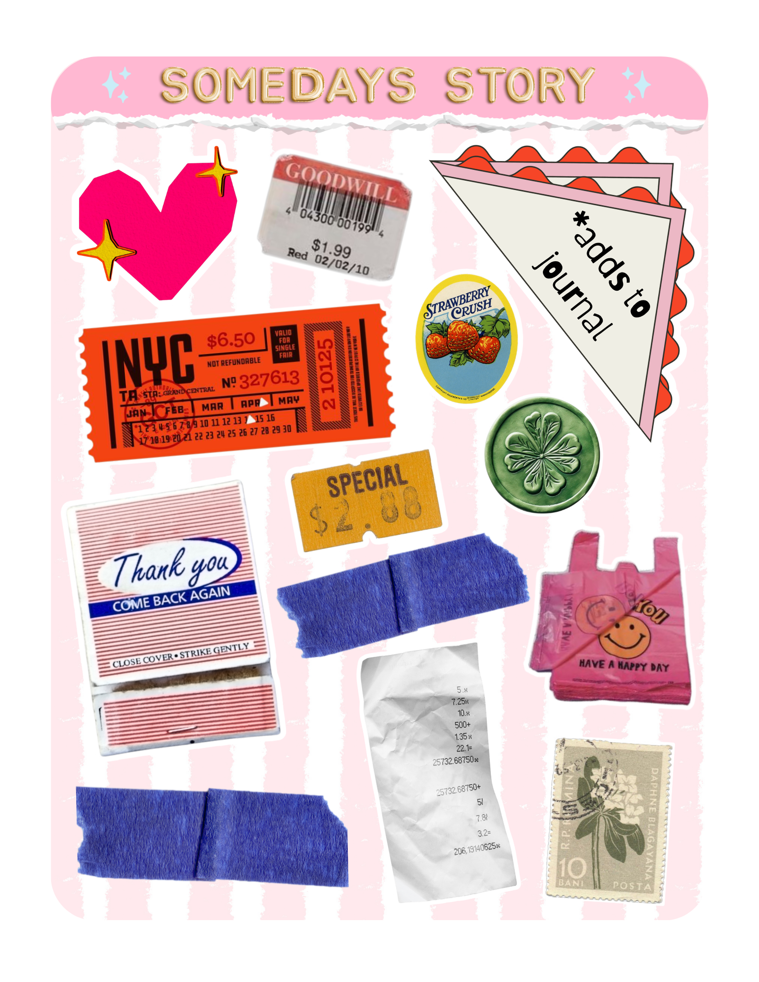 *Adds to Journal is a sticker sheet made to celebrate the way we junk journal: messy, meaningful, and full of soul. This sheet is packed with all the tiny add-ons that bring your pages to life, from ticket stubs to paper clippings to perfectly imperfect edges.